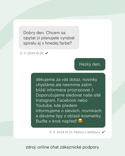 Starostlivosť nekončí odoslaním balíčka. Každý pracovný deň sme vám k dispozícii na chate, telefóne aj e-maile a priebeh doručenia aj vašu spokojnosť si overujeme pri každej expedovanej objednávke. Za rok 2025 sme individuálnou komunikáciou s našimi zákazníkmi strávili 432 000 minút a uskutočnili takmer 100 000 telefonátov! Odpovedáme na otázky k zloženiu, kombinovaniu produktov aj správnemu používaniu – chceme, aby ste vedeli, čo používate a prečo. Či už riešite výber, kombináciu produktov alebo ich správne používanie, sme tu pre vás. Radi vám pomôžeme na online chate, našich sociálnych sieťach, e-maile či telefónnom čísle +420 778 882 455.