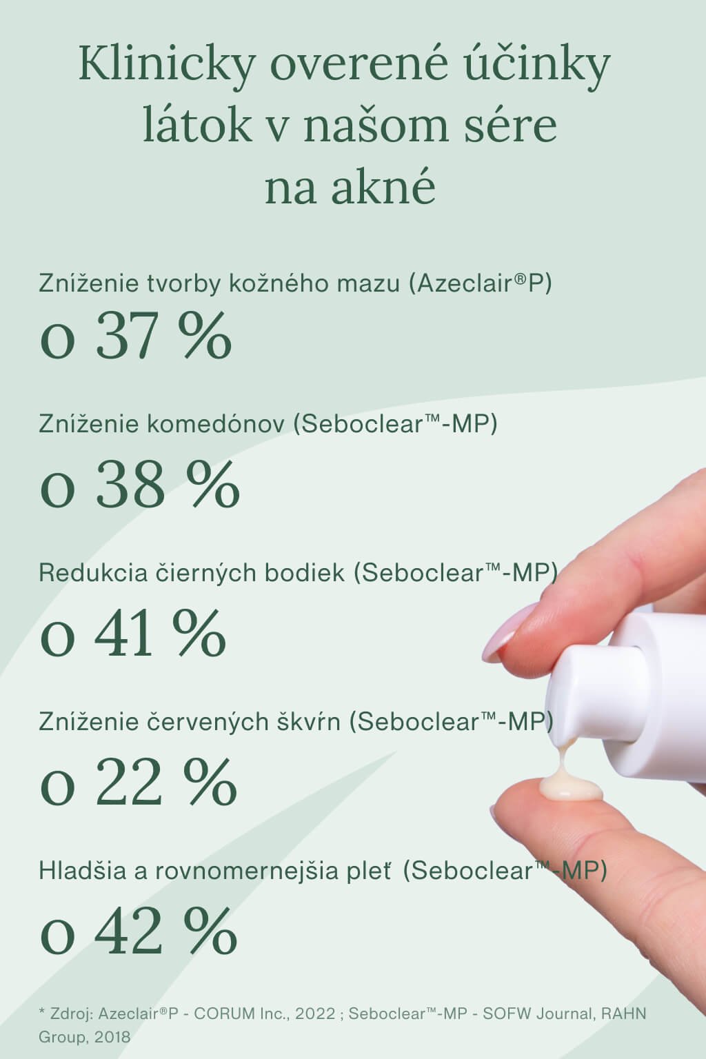 Azeclair® P (5 %) preukázateľne znižuje nadmernú tvorbu mazu až o 37 % počas 28 dní a zanecháva pleť jasnejšiu. Niacinamid (5 %) zlepšuje stav akné, zjednocuje tón pleti a zmenšuje viditeľnosť pórov. Seboclear™-MP redukuje vyrážky a čierne bodky o 41 % a zlepšuje textúru pleti o 42 % po 84 dňoch. Zincidone® (1 %) má antibakteriálne účinky, podporuje hojenie a už po 28 dňoch pomáha udržať pleť menej mastnú a odolnejšiu voči nedokonalostiam.