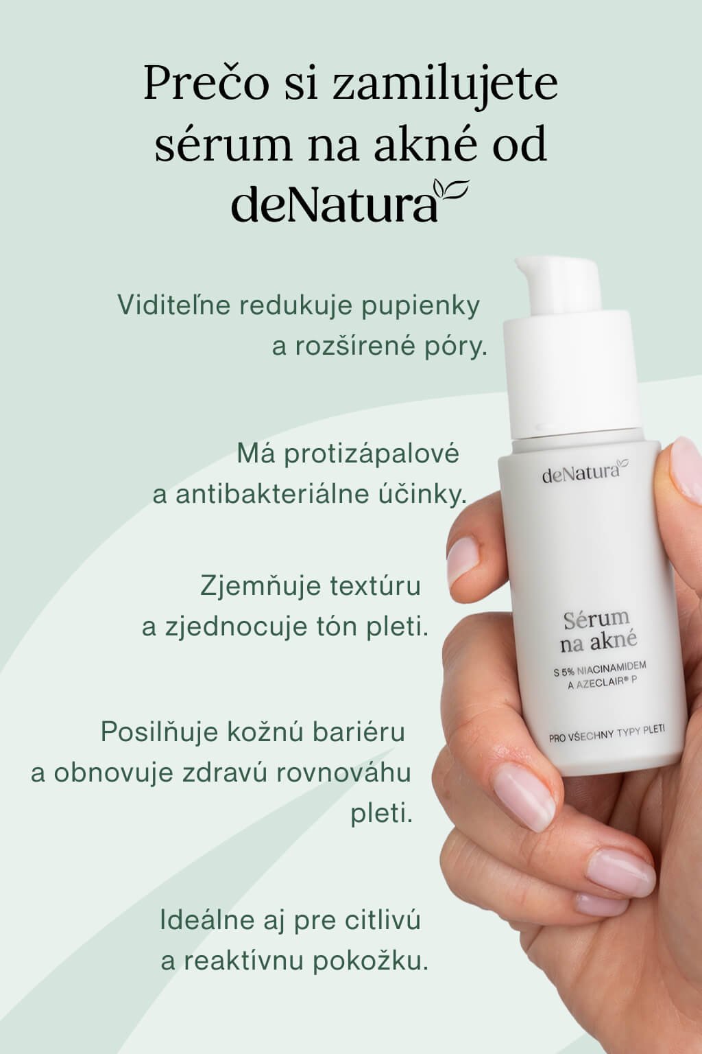 Prírodné sérum na akné je vyvinuté špeciálne pre citlivú, mastnú a problematickú pleť. Kombinuje niacinamid a moderný derivát kyseliny azelaovej, ktoré regulujú tvorbu mazu, zjednocujú tón a rozjasňujú pleť. Bioflavonoidy z rastlín pomáhajú redukovať vyrážky a čierne bodky, zatiaľ čo zinok pôsobí antibakteriálne a podporuje hojenie. O upokojenie sa stará panthenol a pupočník ázijský, ktoré zmierňujú začervenanie a posilňujú kožnú bariéru.