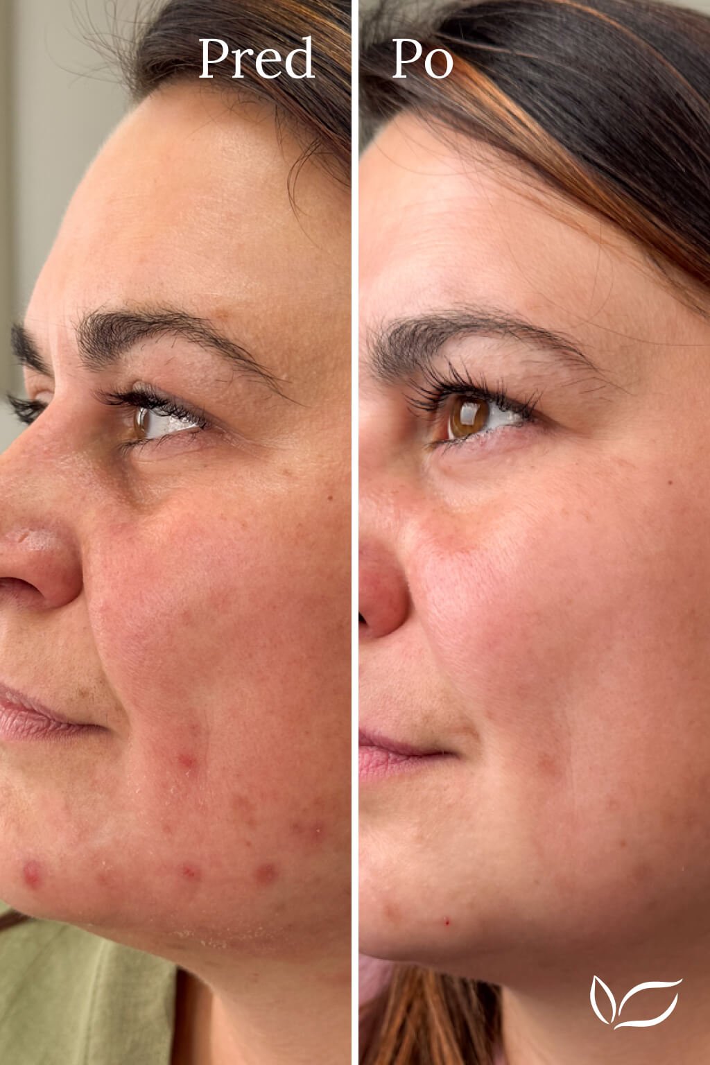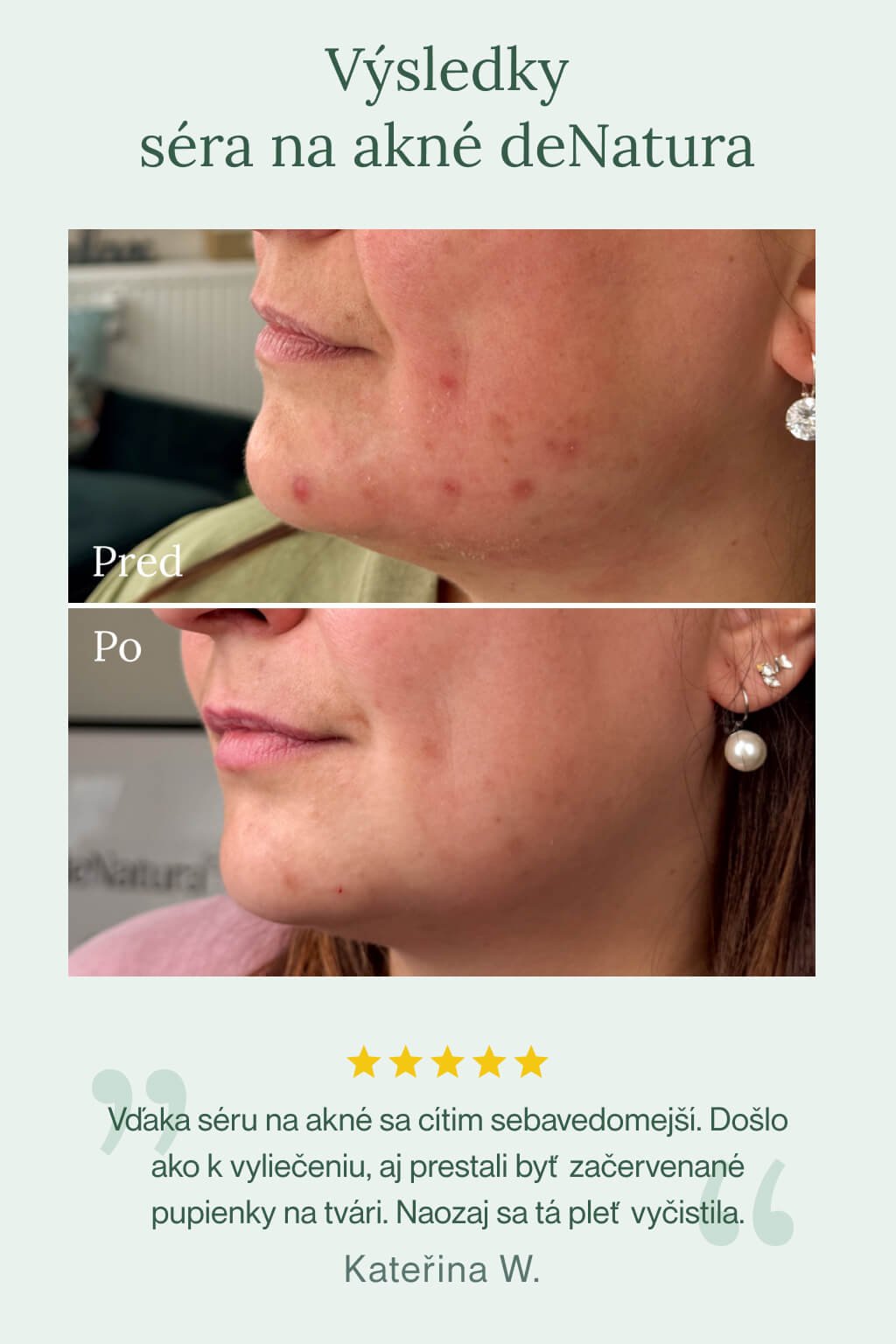 Vyrážky, čierne aj biele bodky sú výrazne redukované. Pleť je zjednotená, vyhladená a stopy po akné menej viditeľné. Pokožka pôsobí zdravo, jasne a vyrovnane.