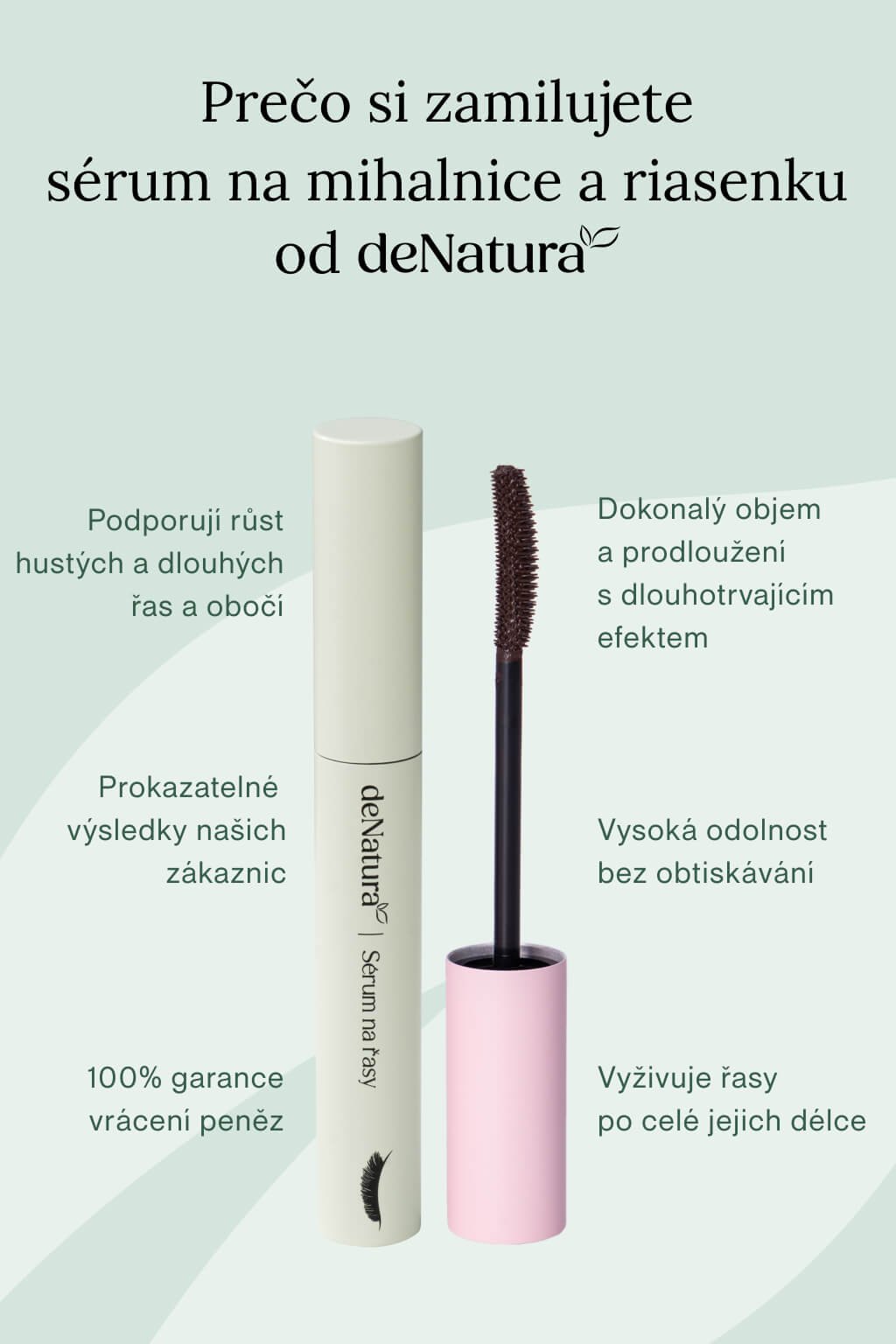 Rastové sérum na mihalnice deNatura obsahuje množstvo aktívnych zložiek, ktoré podporujú rast a celkové zdravie vašich mihalníc. Vďaka bioaktívnym peptidom, rastlinným extraktom a vitamínom poskytuje intenzívnu výživu priamo pri korienkoch. Pri pravidelnom používaní si už po niekoľkých týždňoch všimnete viditeľne hustejšie, pevnejšie a dlhšie mihalnice.