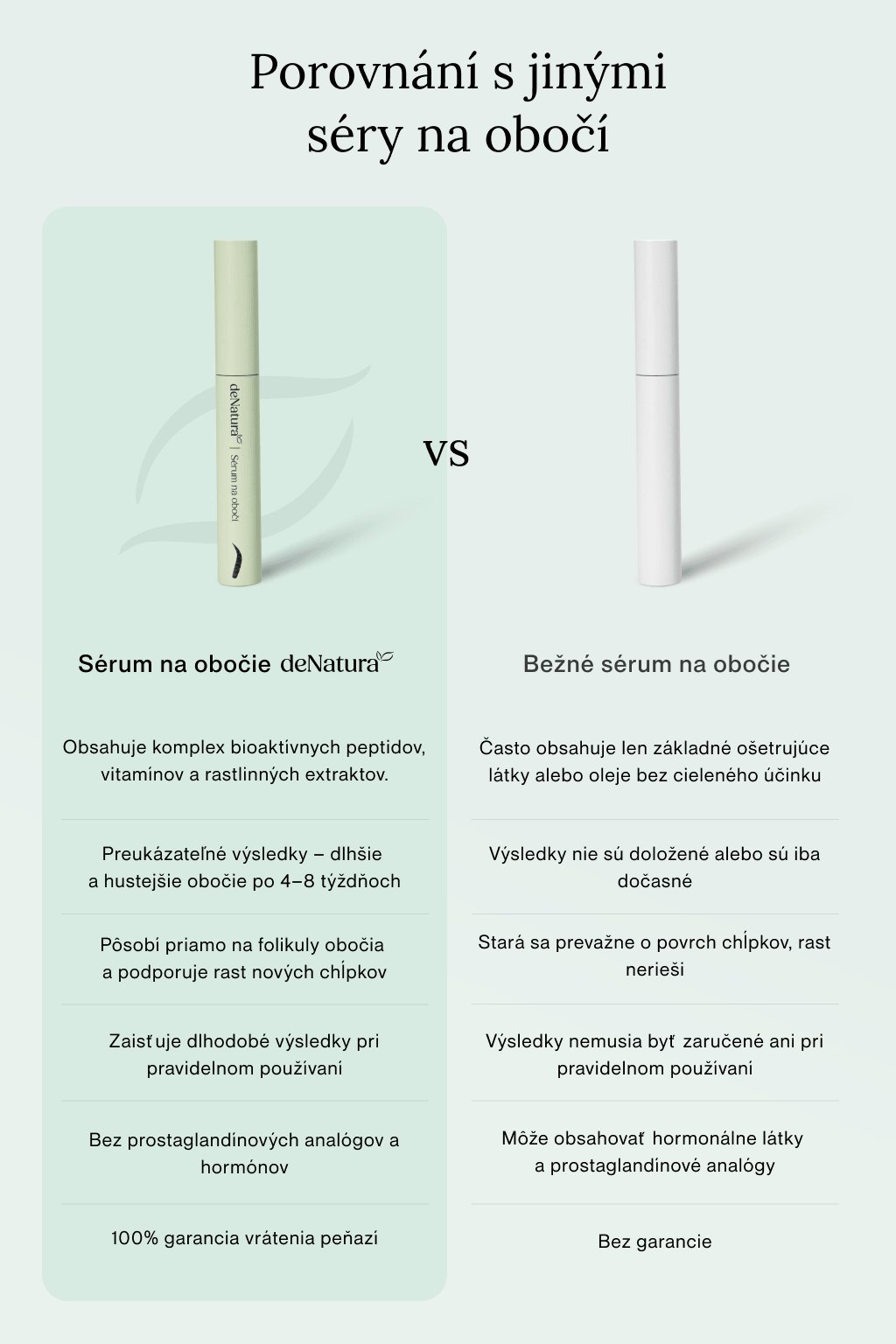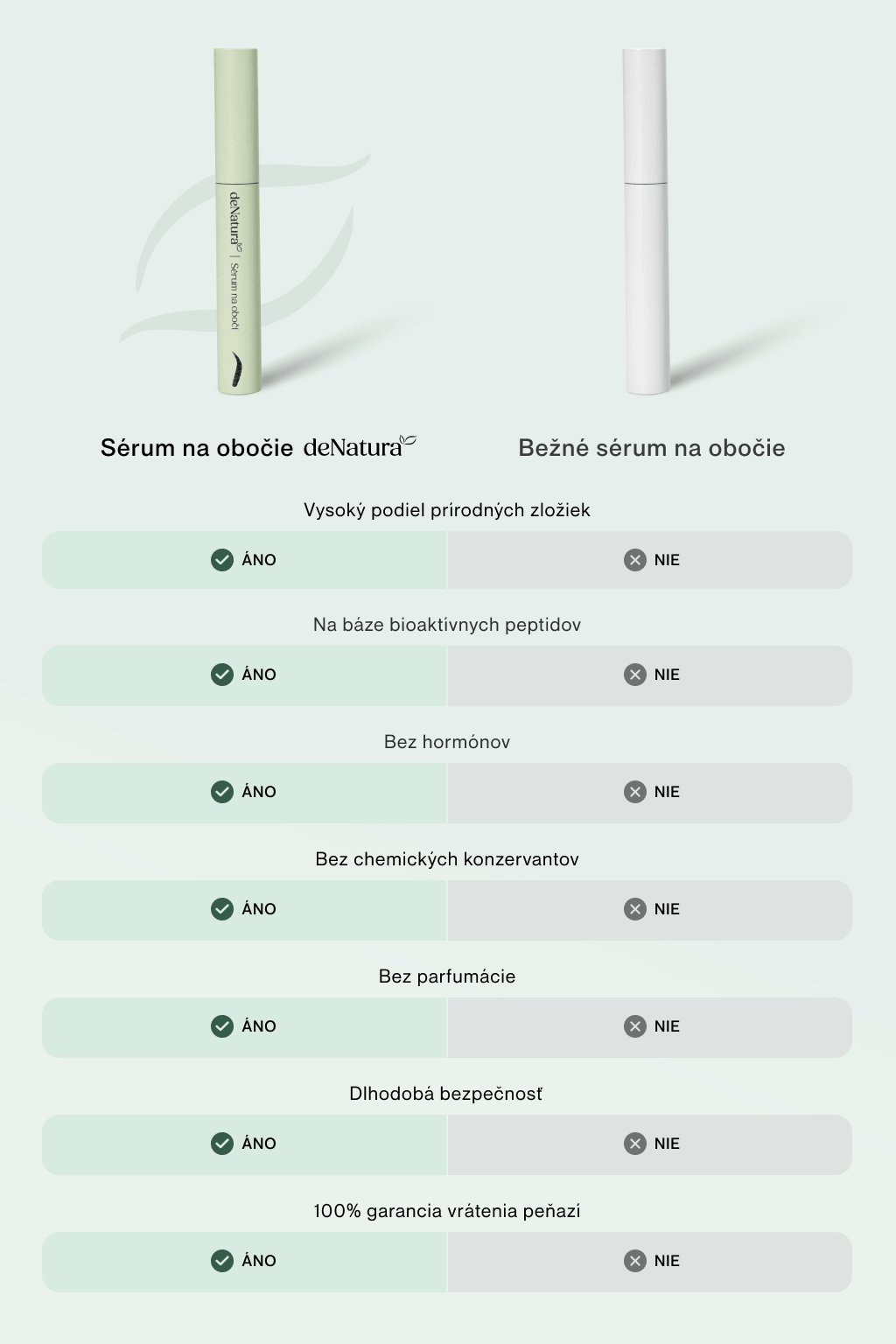 Naše séra na riasy a obočie obsahujú vysoký podiel prírodných zložiek, ako sú rastlinné extrakty a vitamíny. Zároveň v zložení nájdete bezpečné syntetické bioaktívne peptidy, ktoré účinne stimulujú folikuly rias k produkcii keratínu, hlavného proteínu rias a obočia, posilňujú ich a predlžujú anagénnu rastovú fázu. Medzi ďalšie zložky patrí aj kyselina hyalurónová alebo panthenol. Sérum je bez chemických konzervantov, parfemácie a neobsahuje žiadne analógy prostaglandínov, ktoré sa správajú ako hormóny a spôsobujú známe nežiadúce účinky. Kompletné zloženie nájdete na našich webových stránkach: https://www.denatura.sk/zlozenie-produktov-denatura/