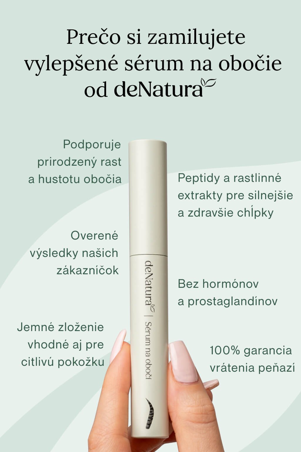 Nové sérum na obočie deNatura kombinuje niekoľko kľúčových skupín účinných zložiek, ktoré stimulujú rast chĺpkov obočia a zlepšujú ich kvalitu. Základom je rozšírený komplex bioaktívnych peptidov, novšie doplnený o ďalší peptid pre ešte intenzívnejšiu starostlivosť, rastlinné extrakty a modernú biotechnologickú aktívnu látku z kmeňových buniek kurkumy. Zloženie ďalej dopĺňajú synergicky pôsobiace látky ako kyselina hyalurónová, panthenol, biotín a vitamín E.