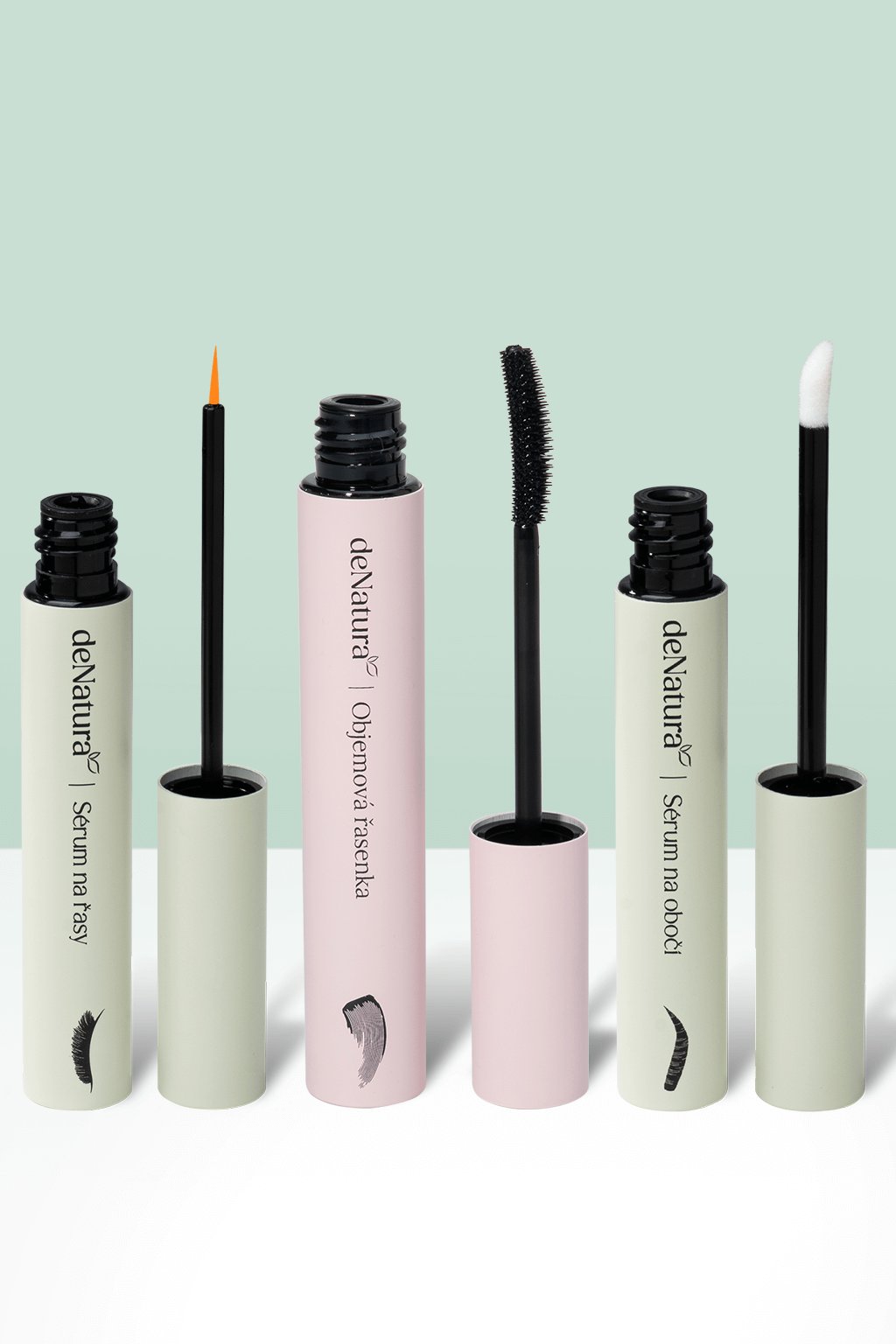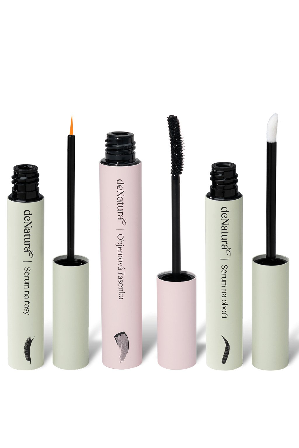 Balíček obsahuje sérum na mihalnice, sérum na obočie a objemovú maskaru. Séra na mihalnice a obočie deNatura predstavujú kombináciu bioaktívnych peptidov, vitamínov a rastlinných výťažkov, ktoré preukázateľne zahusťujú a predlžujú mihalnice a obočie. Vodoodolná objemová maskara dodá vašim mihalniciam maximálny objem a vďaka vyživujúcim zložkám o mihalnice pečuje po celej ich dĺžke. Obsah sér 3ml, obsah špirály 6ml. Špirála teraz v ružovom balení – zloženie aj účinok zostávajú rovnaké.